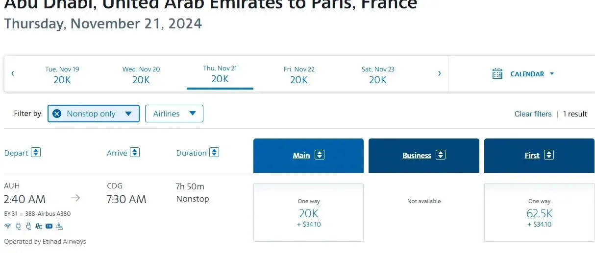 – 如果飞行距离位于1501 – 2000英里:使用英航里程则是11K里程,如果使用阿提哈德航空里程则是需要15K里程