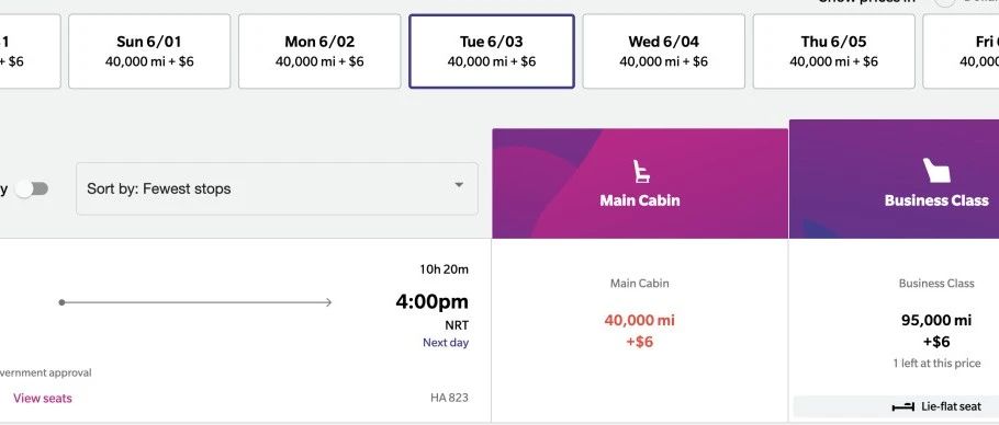 如果我们搜索同一天的达拉斯 – 香港,就会发现商务舱 / 头等舱里程票都会显示0了,这就是为什么这个体系非常不友好的地方了。