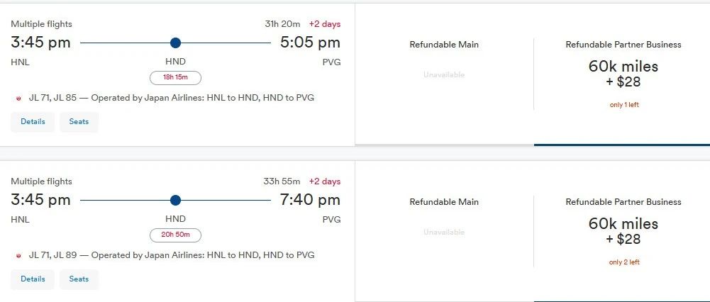 当然全美联运都是可以的,只要美国境内段有X/I舱的里程票放出即可,比如说下面的西雅图 – 旧金山 – 大溪地的例子。