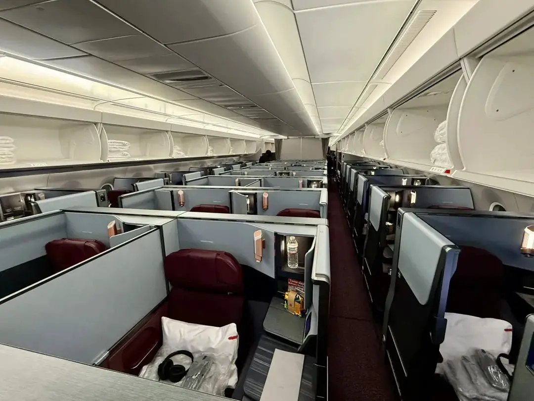 昨晚睡觉之前我看了一眼座位图,商务舱仅仅只剩下了3个位置。不知道为何登机的时候,空姨跟我说今天商务舱只有两个客人。他们把我们一左一右分配在5A和5L,互不打扰。看到熟悉的位置不仅有些感慨,毕竟是第一次这么久没有回了。