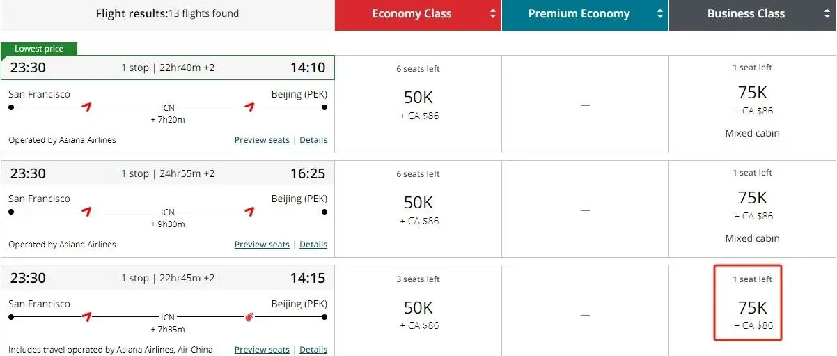又是大规模商务舱里程票放票,一个航班居然放出多达8张!中美平躺商务63K点数轻松拿下