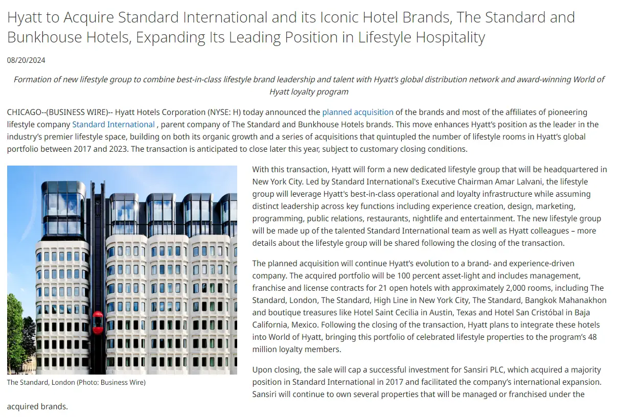 凯悦正式官宣,收购Standard Hotels及旗下多个品牌,版图和品牌数目继续扩张