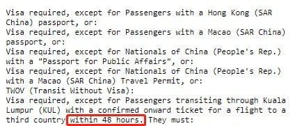 吉隆坡免签转机将会从最多120小时削减到最多48小时