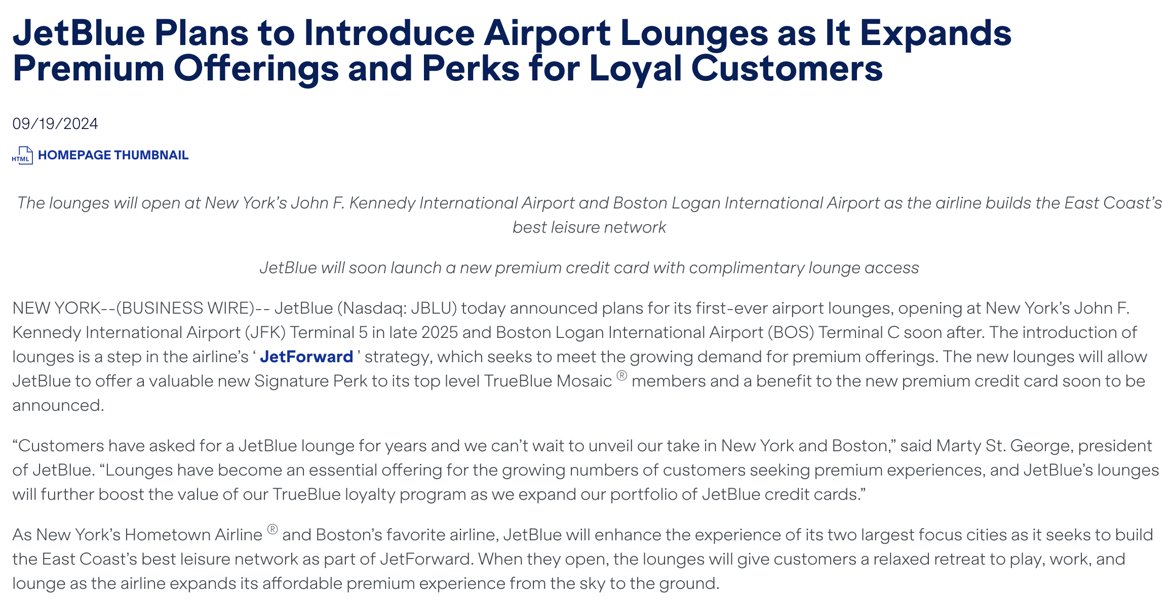 JetBlue大量好消息:将推出机场休息室、全新高端联名卡,高级会员福利升级